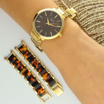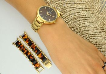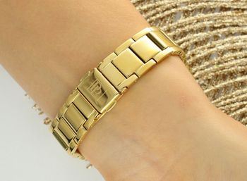Model został wyposażony w stalową bransoletę pokrytą złotą powłoką PVD, która zachwyca blaskiem i trwałością, a biżuteryjne zapięcie typu H gwarantuje komfort i bezpieczeństwo noszenia. W zestawie znajduje się również druga bransoletka gratis – pozłacana, z elementami pancerki, idealnie komponująca się z zegarkiem i tworząca stylowy duet biżuteryjny.