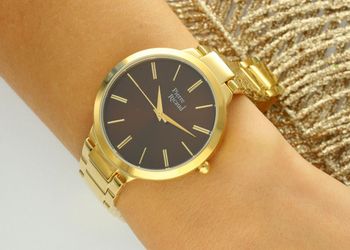 Brązowa tarcza zegarka w połączeniu z pozłacaną kopertą tworzy spójną, kobiecą i elegancką kompozycję. Mineralne szkło chroni tarczę przed zarysowaniami, zapewniając jej estetyczny wygląd przez długi czas.